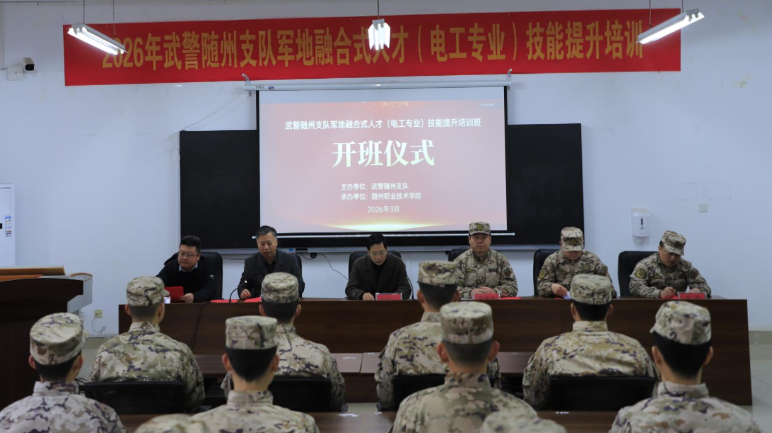 为深入贯彻军民融合发展战略,切实提升武警官兵专业技能水平,拓宽成长成才路径,3月20日,武警随州支队与随州职业技术学院专用汽车与应急产业学院联合举办的军地融合式人才(电工专业)技能提升培训班正式开班。校党委委员、副校长邹厚亏和武警随州支队主要领导出席,专用汽车与应急产业学院和保卫处负责人等部门负责人参加。